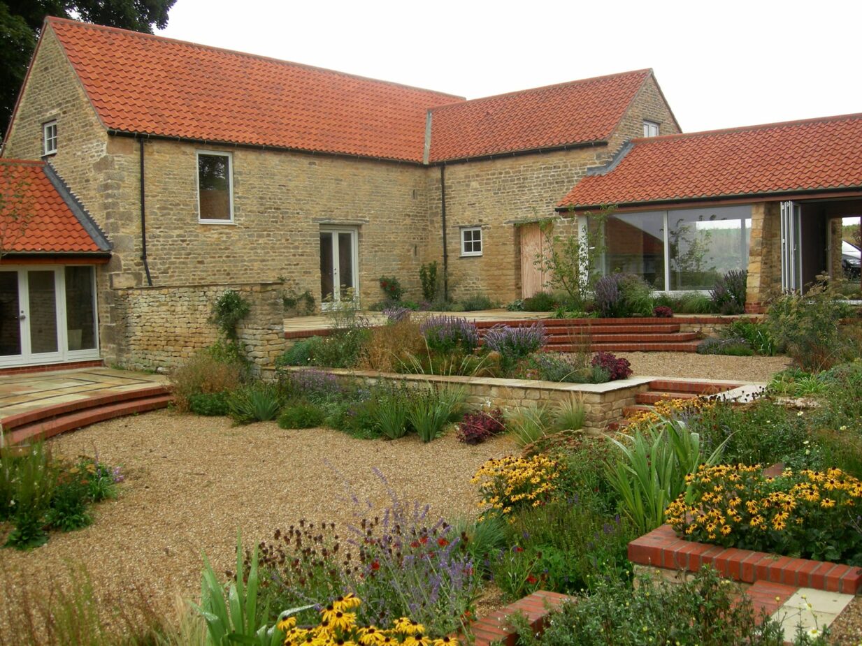 Material choices of gravel, red brick and sandstone were essential to promote sense that the house has always been there and is integral to the expanding landscape beyond the stone walls. Free draining gravel is the perfect medium for the beautiful naturalistic planting that bleeds from the beds out onto the paths. The planting choices including Acheillea, Rudbekia and hardy grasses which add texture, feathery structure a softness against the stone walling. The planting helps emphasis the link with the local countryside and provide plenty of nectar and pollen for visiting insects. Trees were also placed strategically to screen an unsightly telecom aerial but also leads the eye around the garden towards the garden gate and scenery beyond the walls.