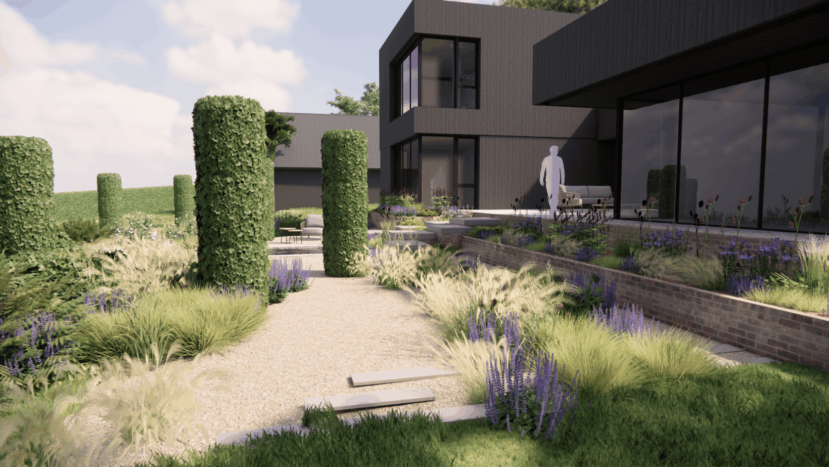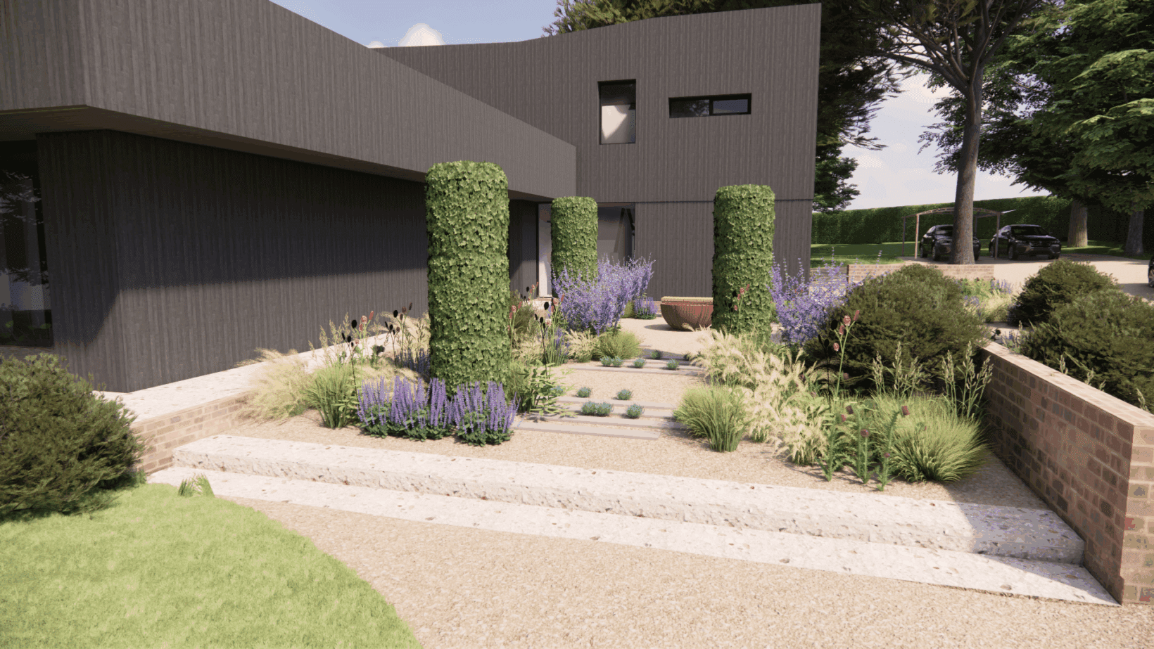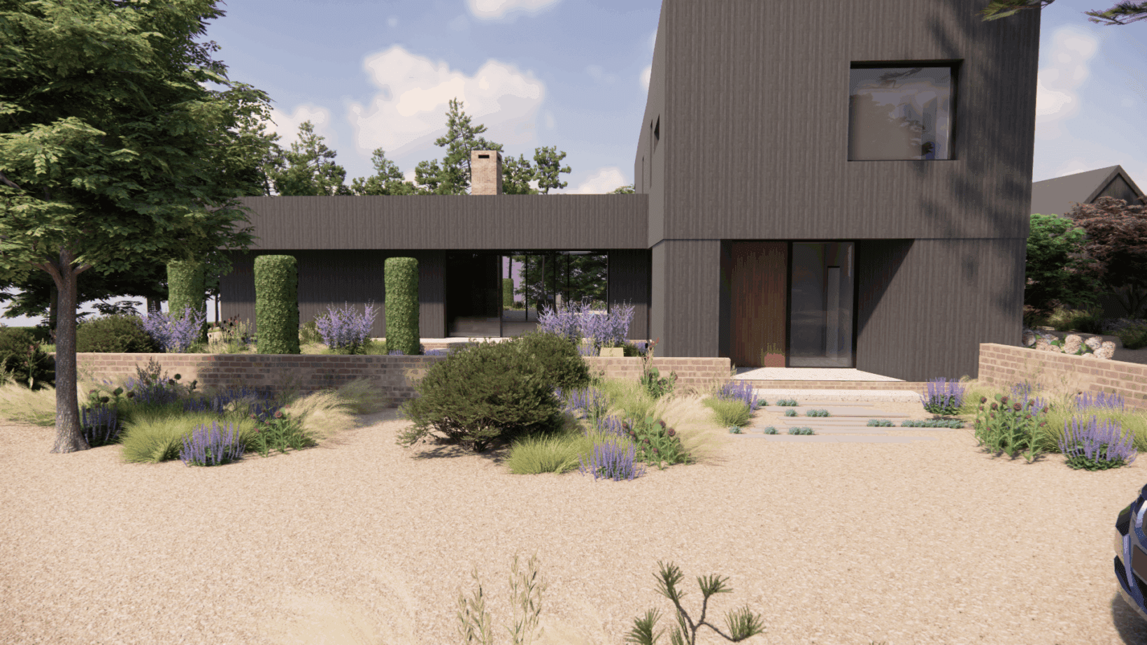 Our design utilises extensive gravel gardens, planted with thousands of perennials and grasses to give the space a ‘wild’ feel. The gravel also blurs the bounds of the driveway and parking areas, making the whole area feel like one cohesive space.