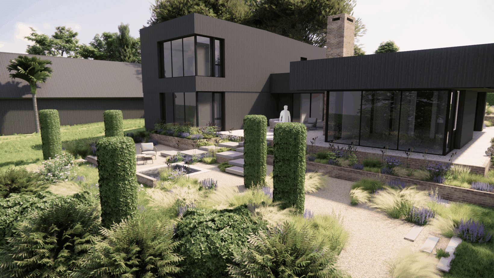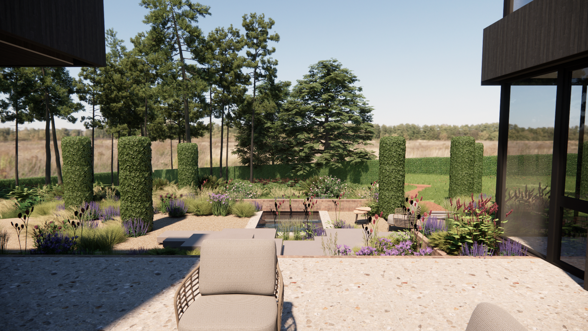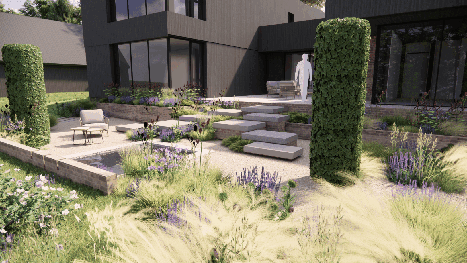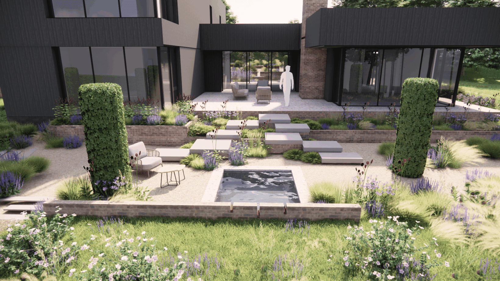 Beech columns are scattered through the space to reference the pine forest that once stood on the site, of which a small enclave still exists on the site. The house, designed by Allan Joyce Architects, sits on a large brick plinth that we continued to create brick raised beds with bespoke porcelain steps through to guide users from the main patio down to the back garden area. The back garden contains a bespoke water feature nestled into the planting, and guiding the eye on to the countryside views beyond.