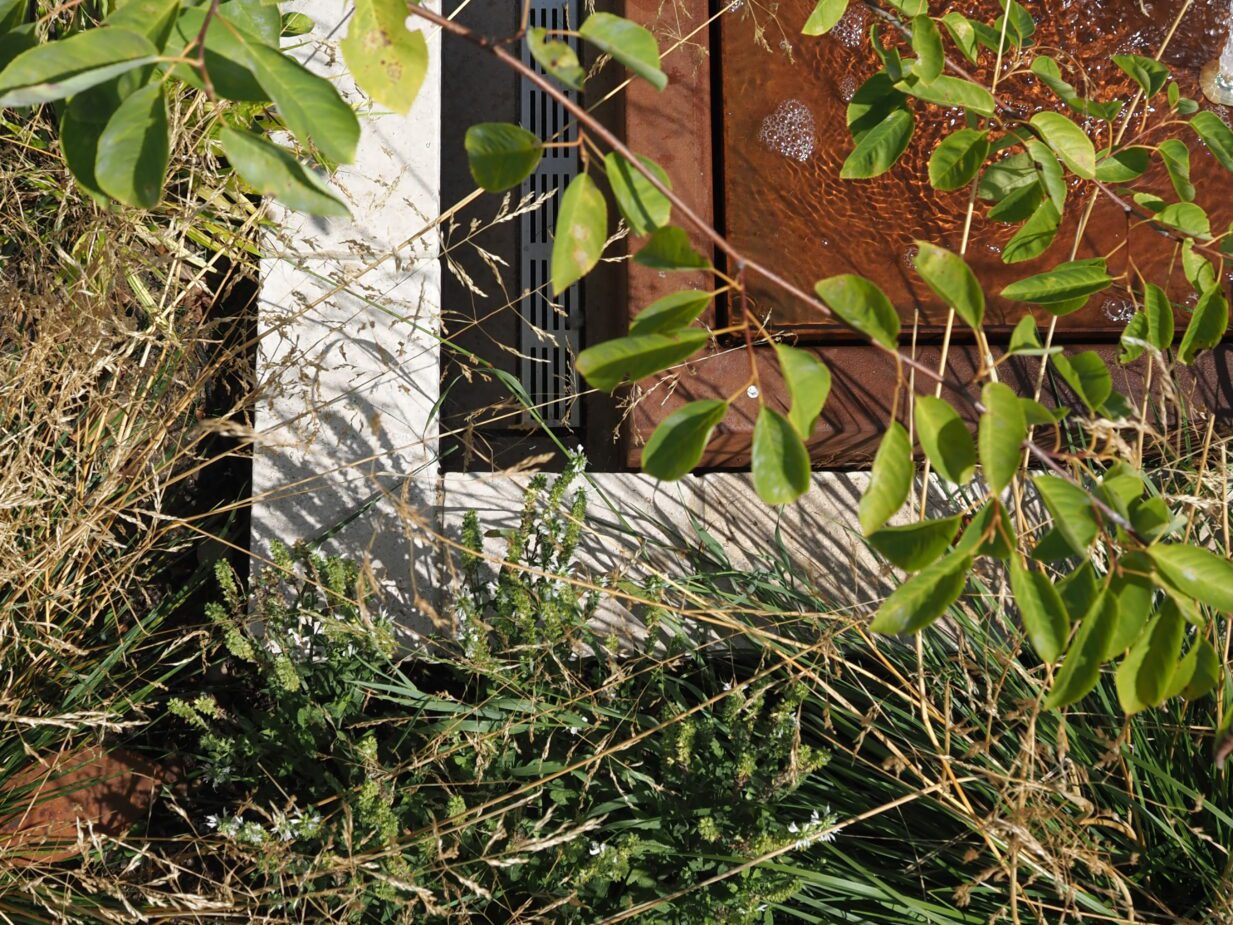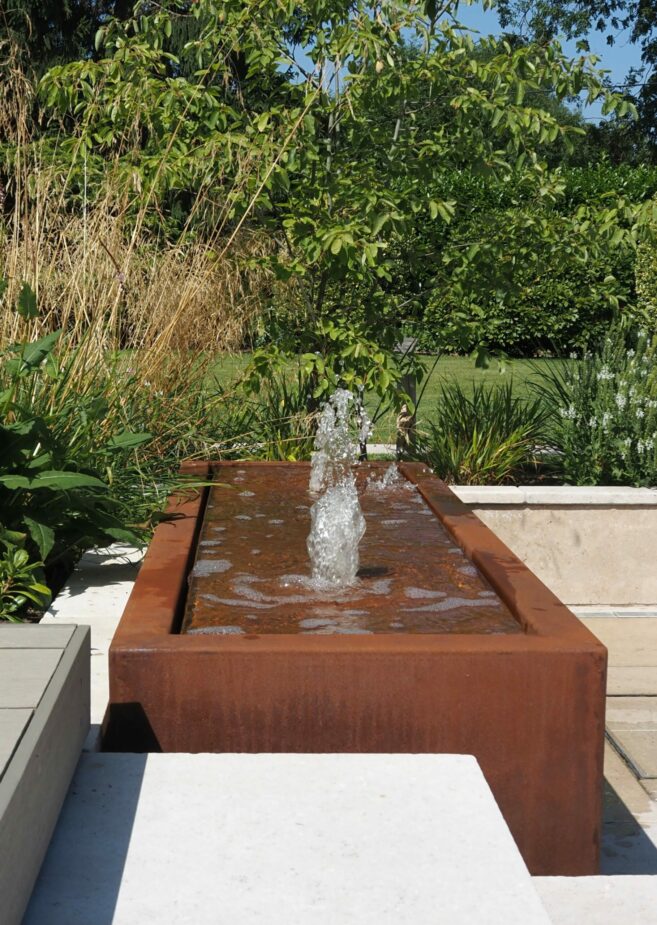 The material palette was carefully selected to compliment the existing textures and materials used for the building. Tumbled limestone was used for the paving and sunken seating area, while Cor-Ten steel accents were scattered through the space to pick up the reddish brown tones of the existing brick. We sourced similar bricks to edge the planting beds that were used to edge the existing path around the house, and clad the tired white-rendered boundary wall with cedar to give the wall a new lease of life.