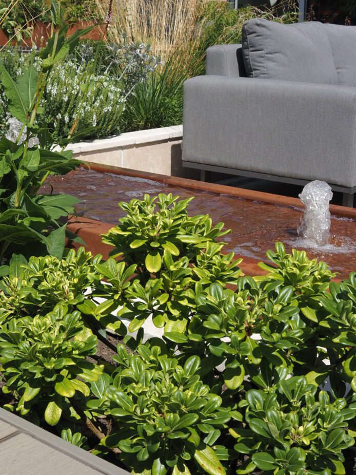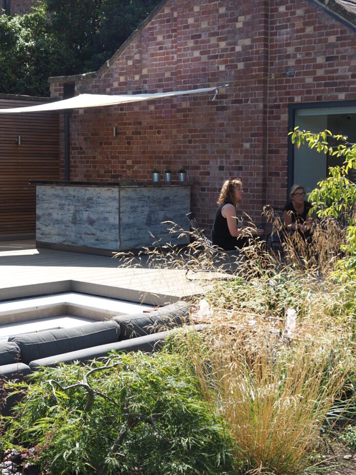 Our clients requested a contemporary pergola that matches the new black aluminium windows, a sunken seating area, and a space for their garden bar. Our design team started by zoning the garden into separate areas, a raised deck for dining, a sunken seating area complete with a Cor-Ten steel water feature, and a patio large enough to house the pergola for when some coverage was required.