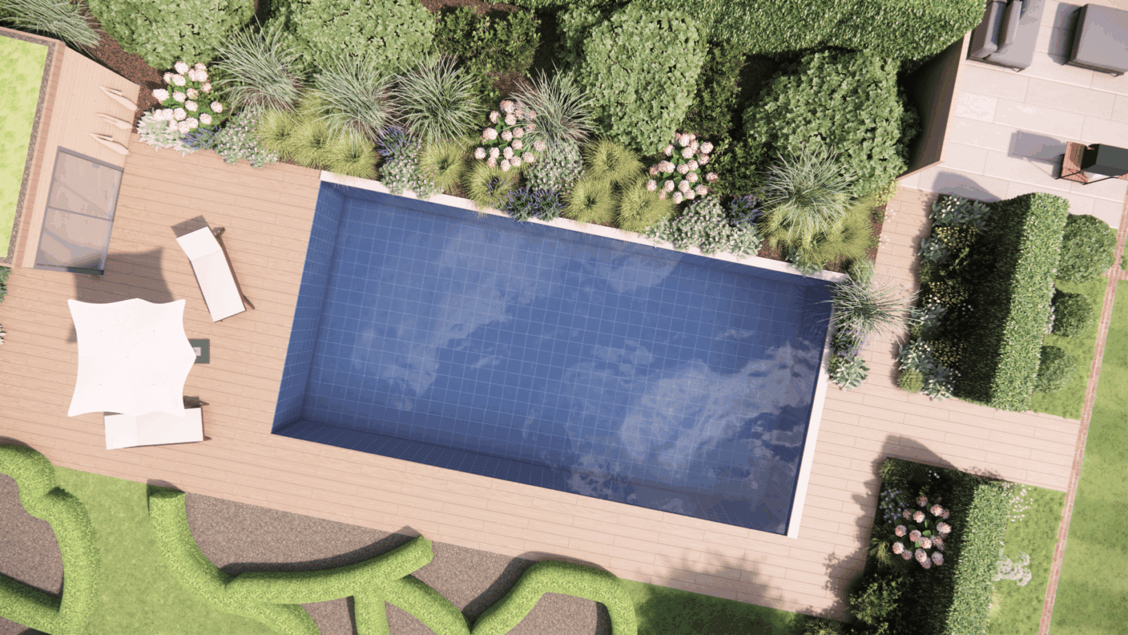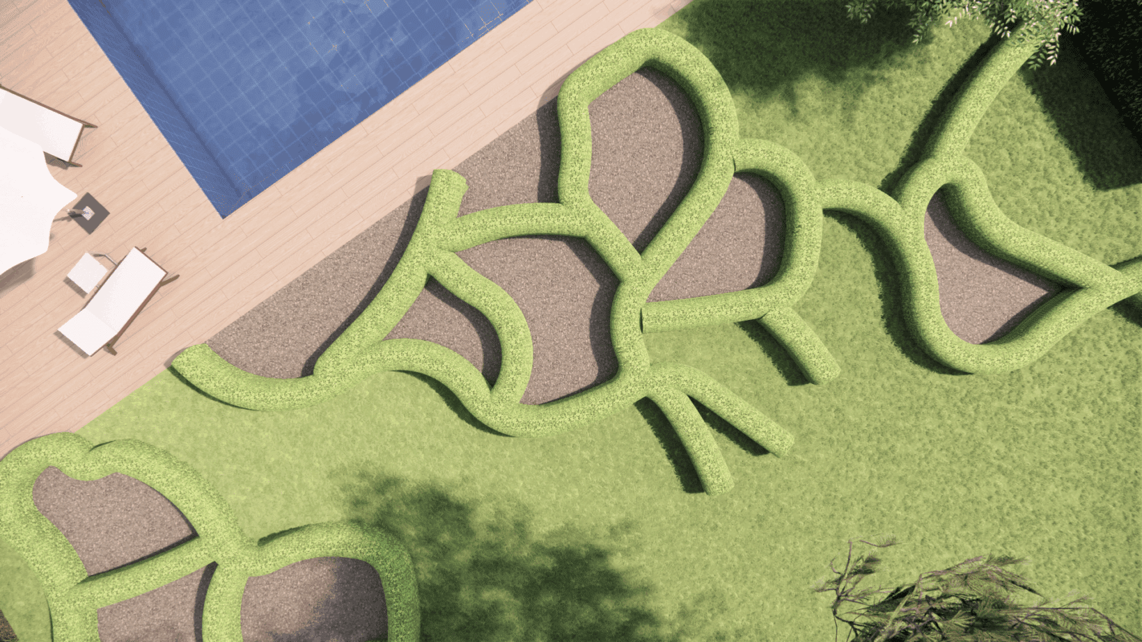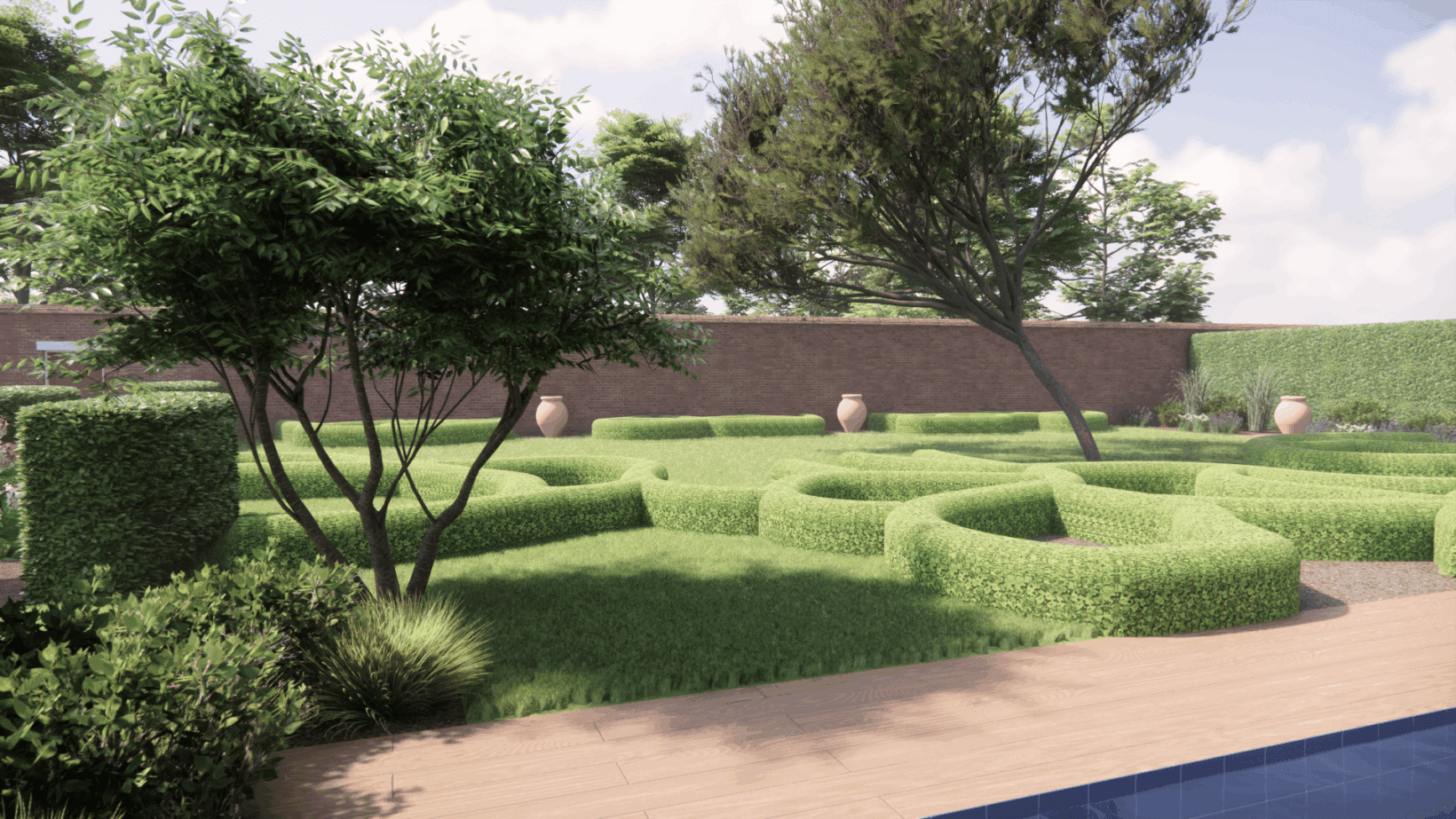 The client is a fan of garden croquet, so a lawn of 17.5 x 14m (regulation garden croquet size), marked with clay pavers, was put at the heart of the space. The lawn bleeds out into paths and planting beds, and is edged with topiary Yew domes to provide interest as well as year-round structure. A decked swimming pool complete with pool house sits on the west side of the garden, and is edged with planting down one side to give an immersive feel and define the pool as part of the garden, rather than just sitting within it. Directly next to the swimming pool sits a parterre garden, that is centered around an old Walnut tree. The parterre was given a contemporary edge through it’s organic curved shapes, giving it a much more abstract look and feel than is traditional. The parterres are planted with bulbs to provide a burst of spring interest.