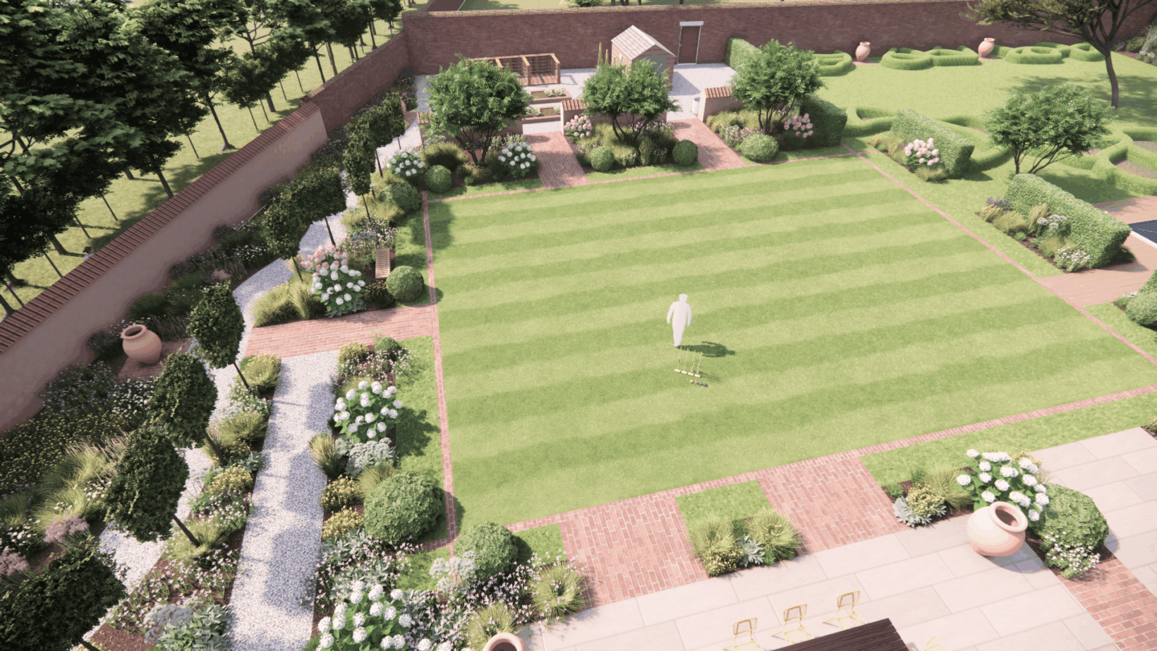 It was decided that the garden should be broadly traditional in it’s style, with contemporary features and planting that is resilient enough to cope with the heavy, poorly draining soil, that also dries out in the summer months. We divided the garden up into ‘rooms’ centered around key features, such as a croquet lawn, swimming pool and kitchen garden.