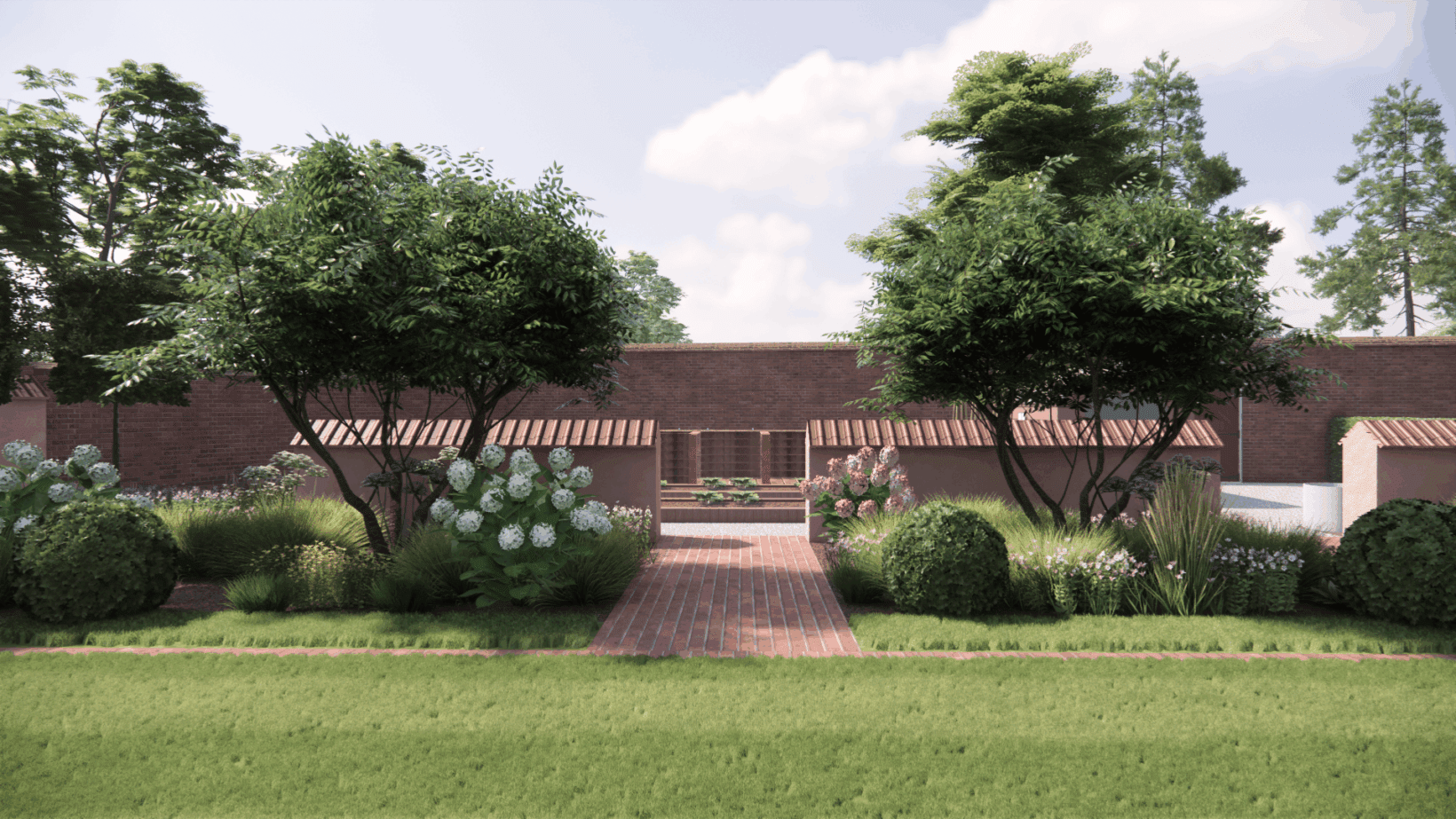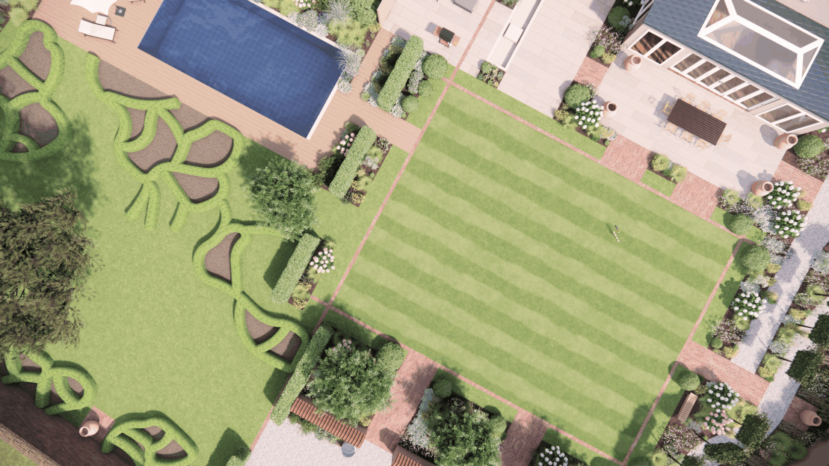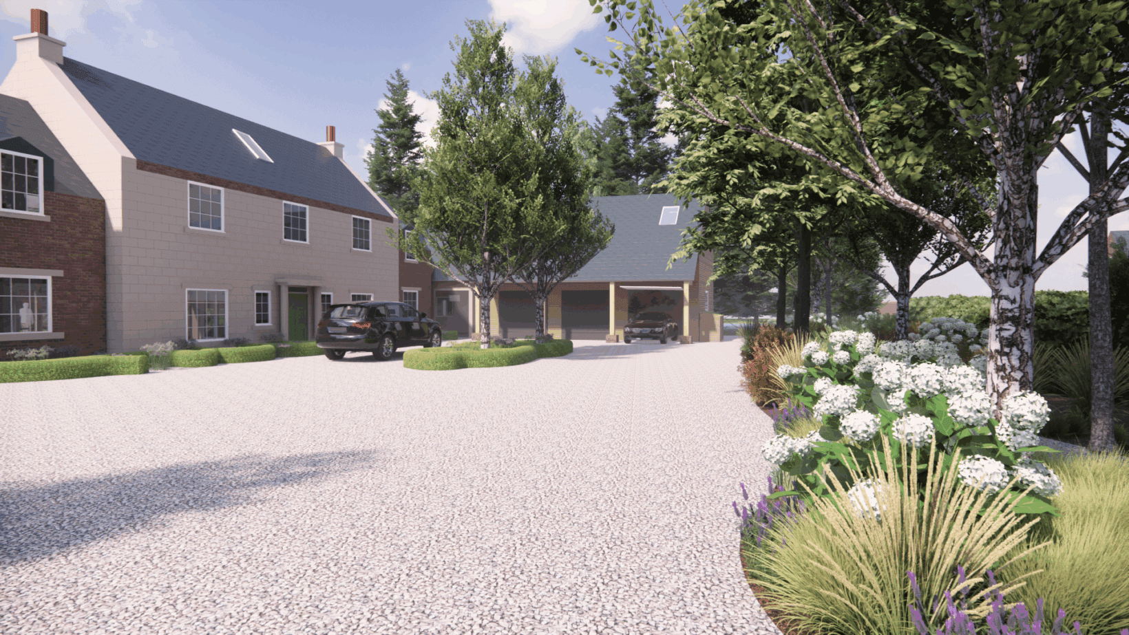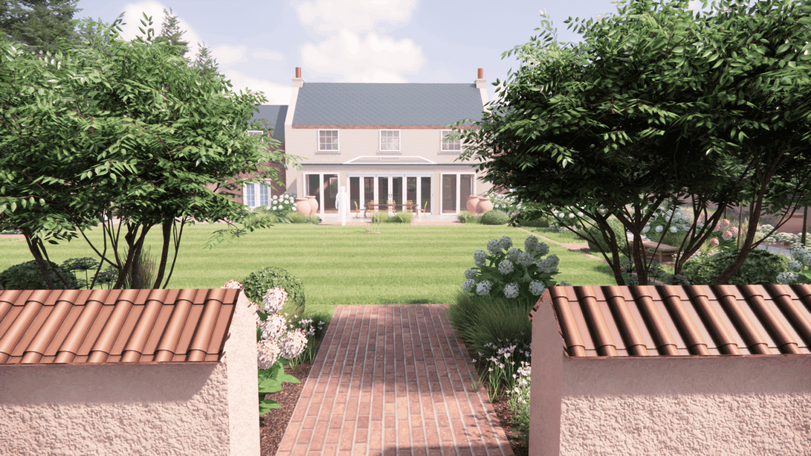 APT Studios were asked to design the gardens for a new build property in Leicestershire, the house is Georgian-style with locally sourced Ironstone, reclaimed red bricks, and a Welsh slate roof.