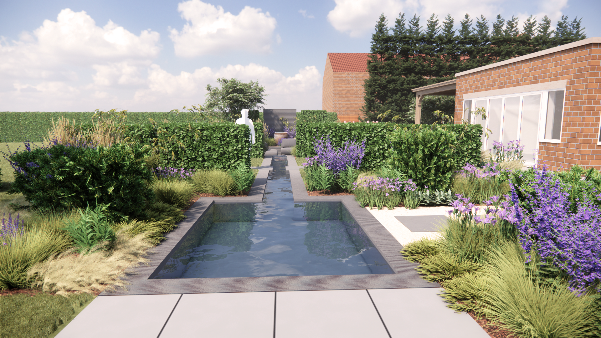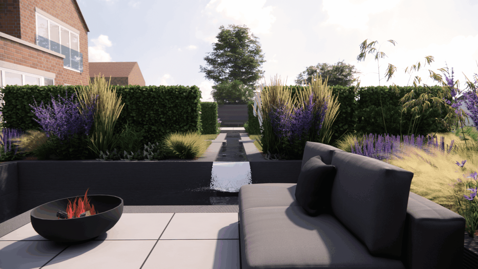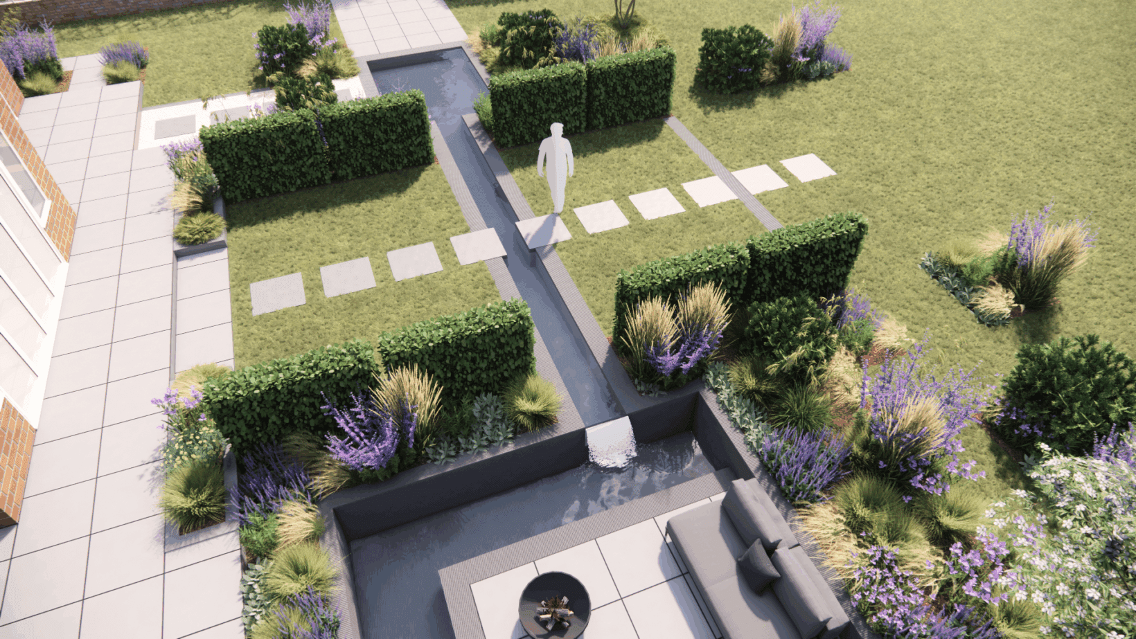 Our client asked us to create a garden that would have symmetry, a sense of formality that matches the house, and for a sunken seating area to entertain, alongside a water feature.