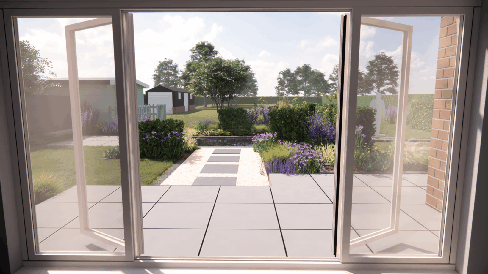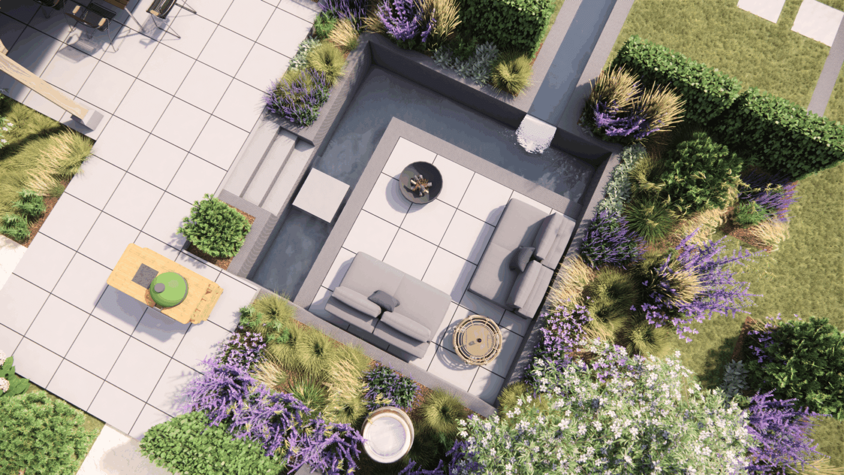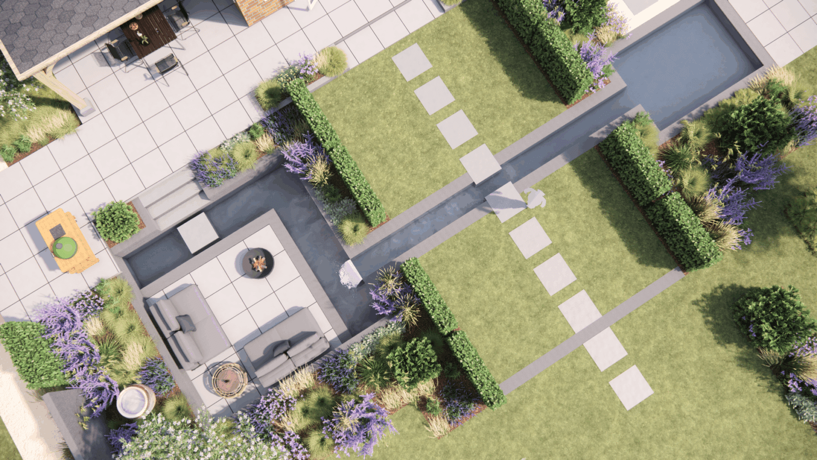 Our client asked us to create a garden that would have symmetry, a sense of formality that matches the house, and for a sunken seating area to entertain, alongside a water feature.