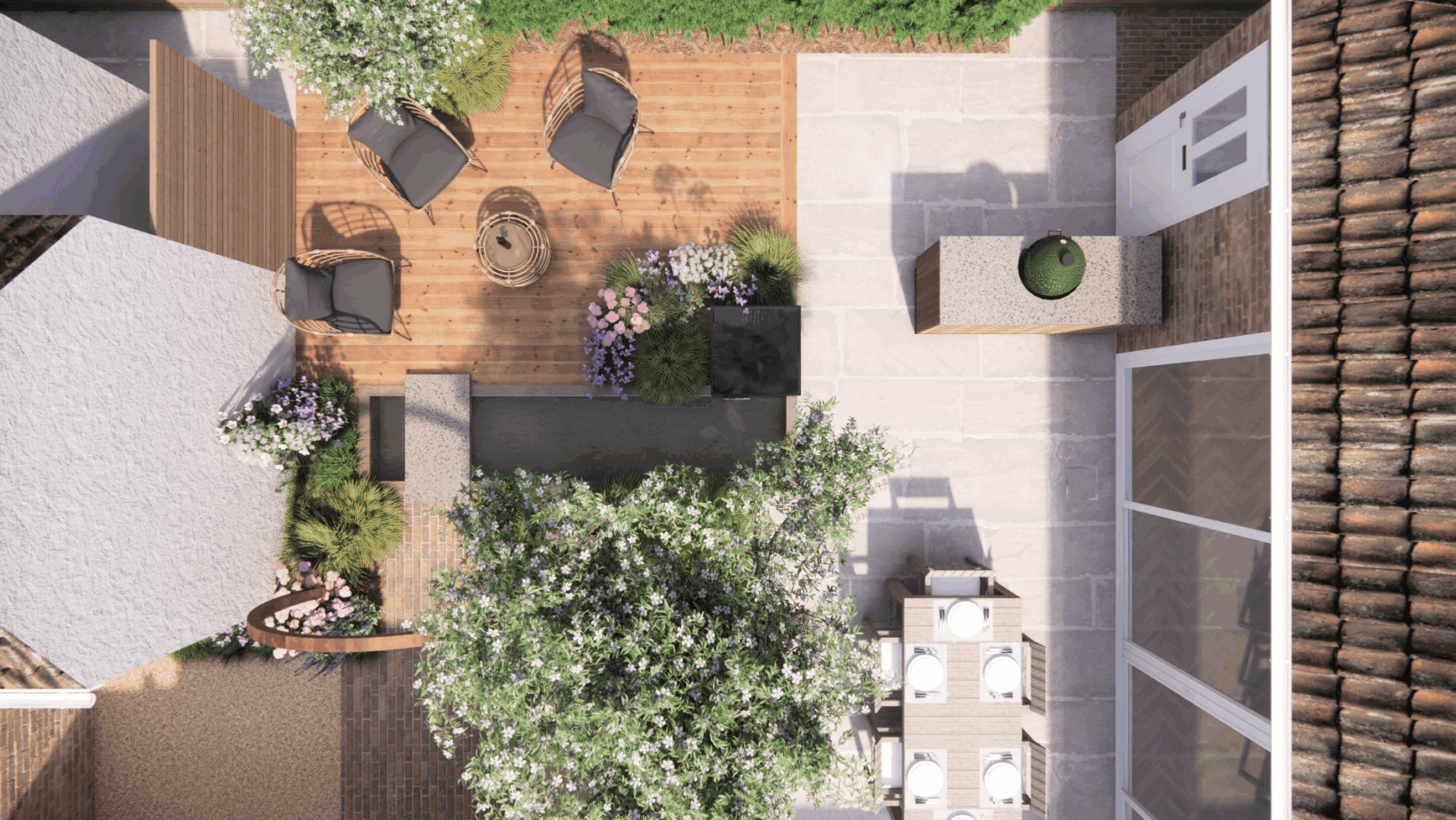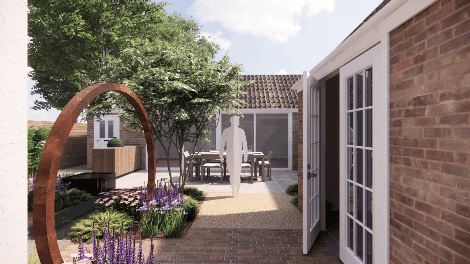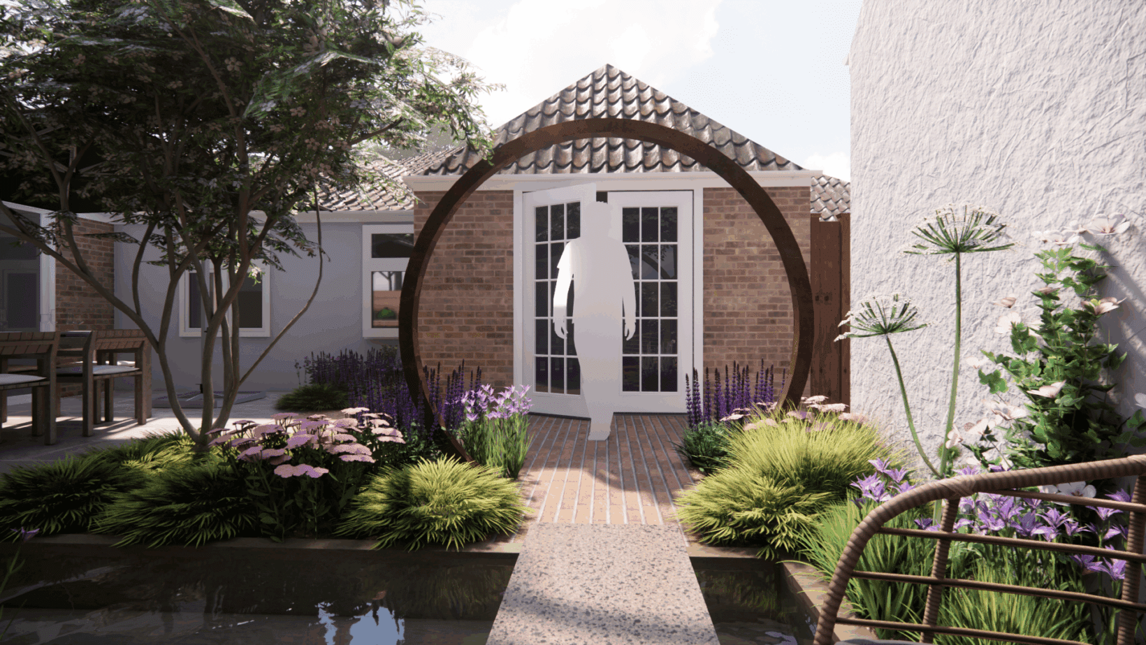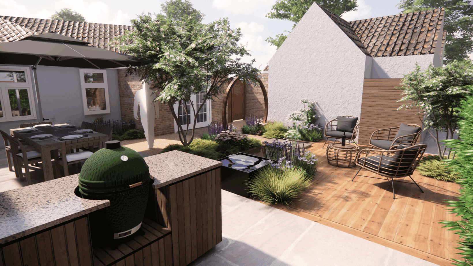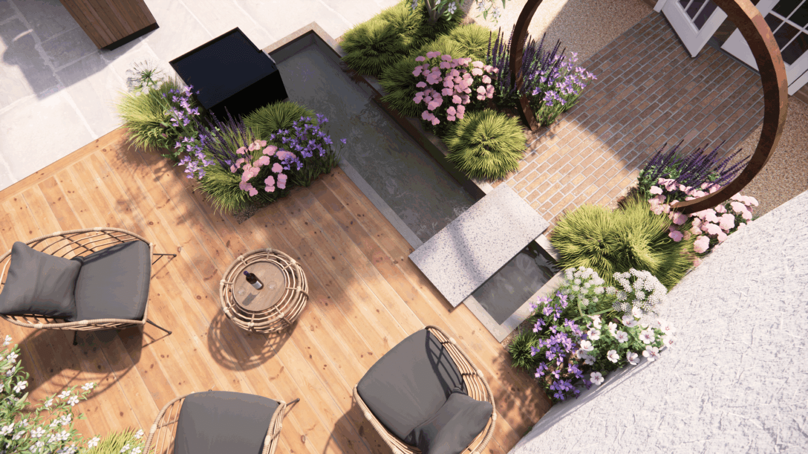 This garden is designed to look its best from all angles, as it can be seen from almost all of the rooms in the house. We centered this garden around a central water feature surrounded by planting, in a nod to Arabic gardens. The water feature divides the garden into sections: a patio for outdoor cooking and dining, a decked area to soak up the late afternoon sun, and a clay paved path to guide you from the master bedroom out through the corten steel moon gate.