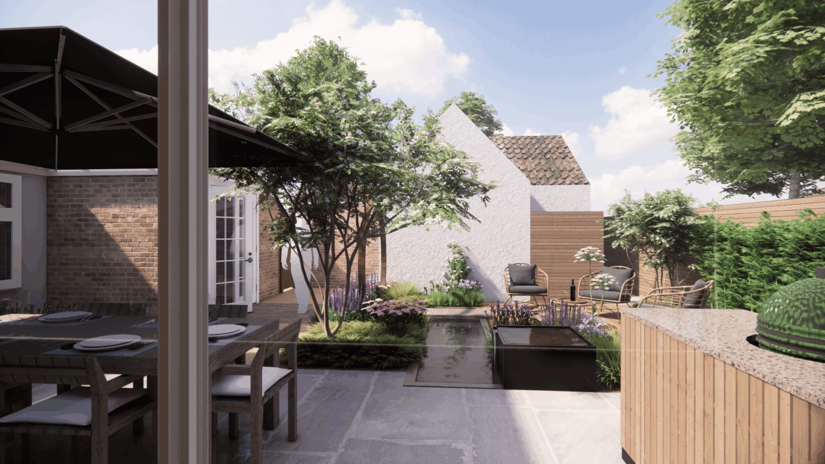 We were asked to transform a small paved area into an intimate courtyard garden for our clients to enjoy during their visits to the UK from the Middle East. The garden should be a space for entertaining, relaxing and softened by planting, while making a feature of the white rendered walls of the neighbouring property.