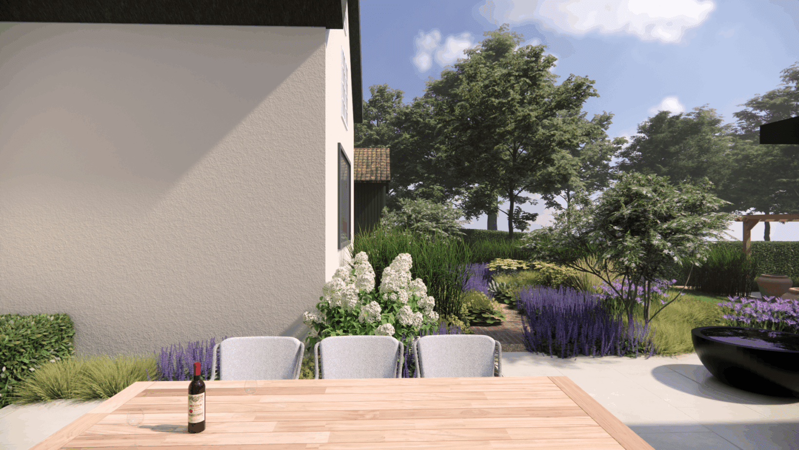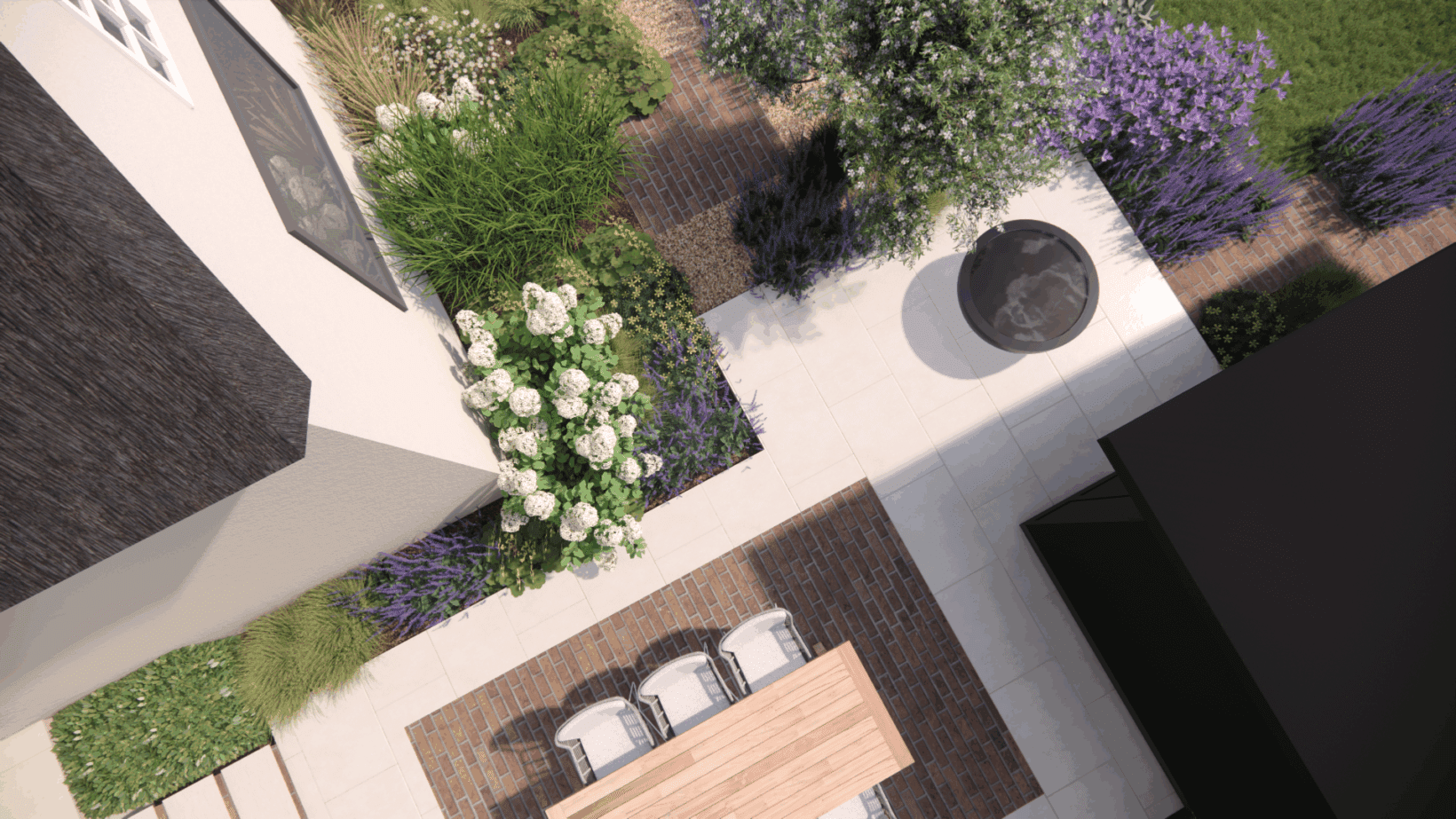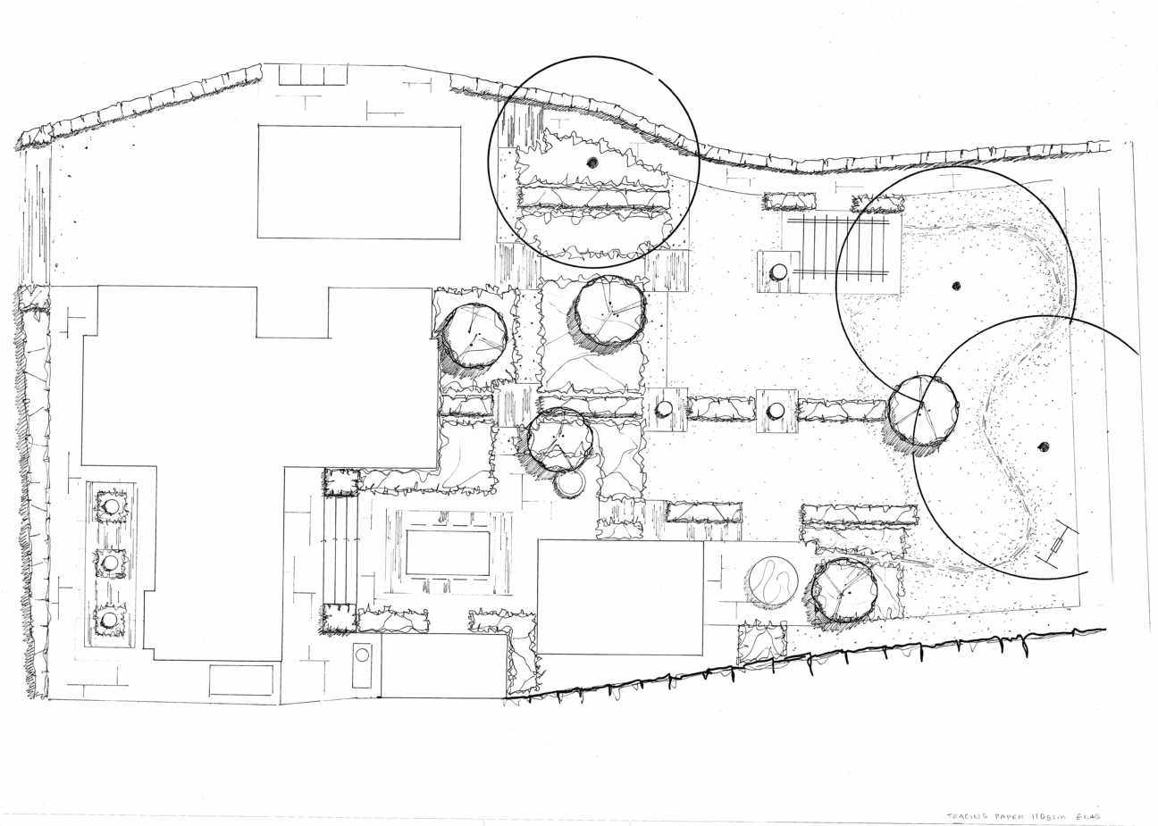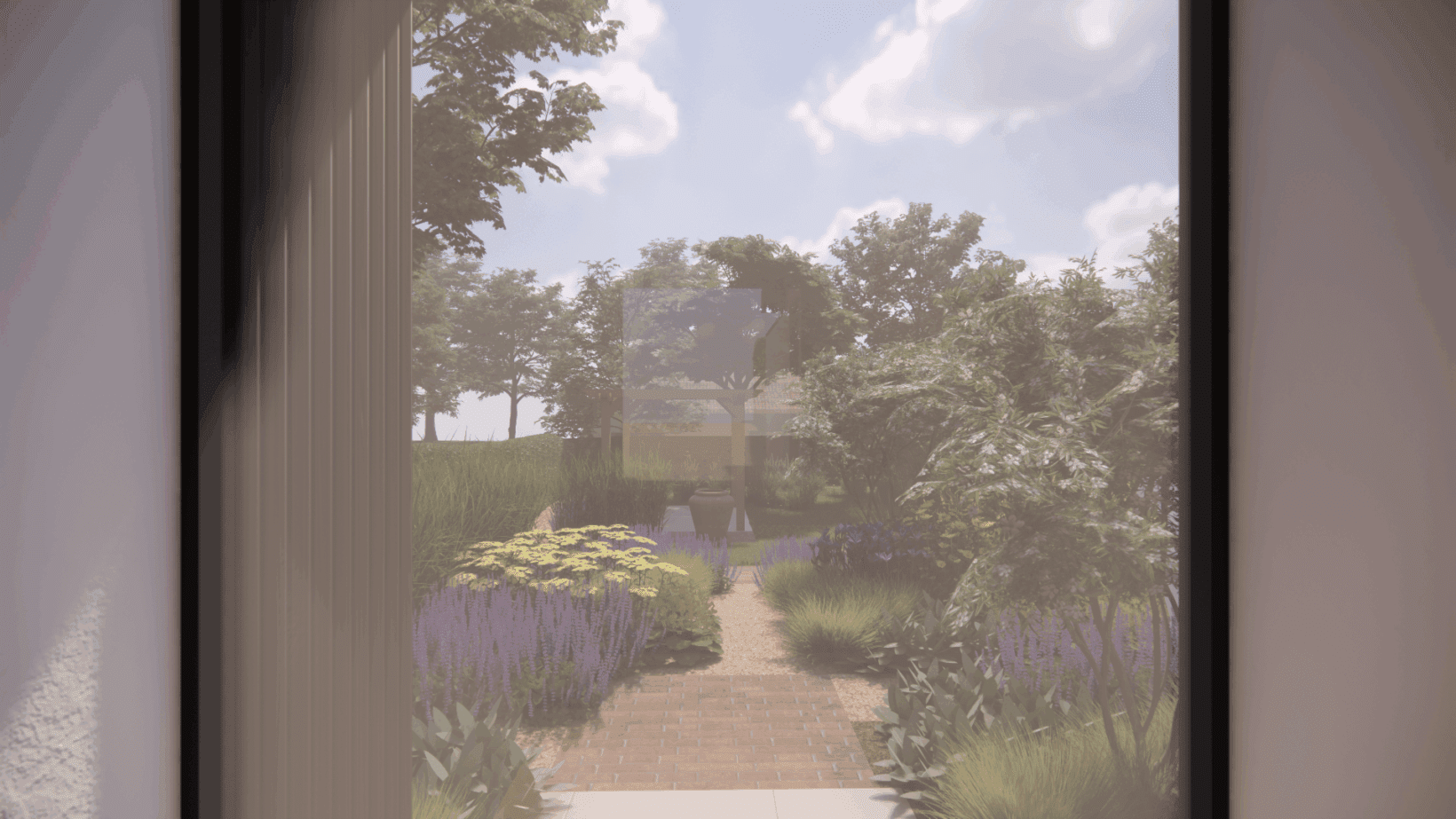 We designed the garden to be a series of spaces, laid out to create a journey around the garden. A re-organised split level paved terrace and generous steps lead you down from the house to the main outdoor dining area complete with inset clay pavers, a water feature, and planting to create interest year round.