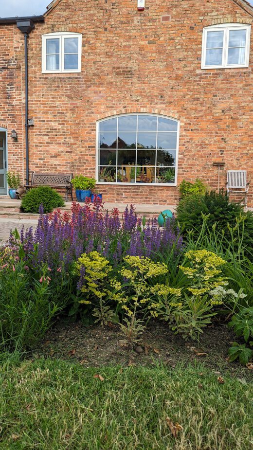We had the pleasure of designing the garden of an Old Hall set on the outskirts of a small village in Nottinghamshire. The brief was to design part of the existing gardens to accentuate the beautiful gnarled old apple trees and garden hedges but add planting and colour to help the house feel more grounded. Lawn covered the majority of the garden with a few orchard trees but only a small amount of planting. Creating movement, height and seasonal interest was key to the challenge of bringing this design to life. Being on the edge of a village the garden held views across rural agricultural fields so the extended landscape needed to be considered as part of the garden.